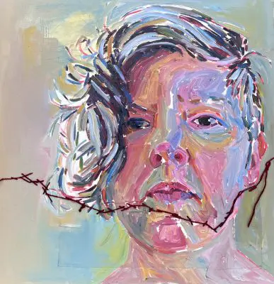 In 2022, Deborah Tomlin was diagnosed with breast cancer from a routine mammogram. She underwent treatment, which consisted of three different surgeries including a bilateral mastectomy. In SUTRA, Tomlin chooses to paint her scars and unfamiliar body and to examine the healing process through her art. As Audre Lorde expresses, in The Cancer Journals, “Any woman who has had a breast removed because of cancer knows she does not feel the same. But we are allowed no psychic time or space to examine what our true feelings are, to make them our own. With quick cosmetic reassurance, we are told that our feelings are not important, our appearance is all, the sum total of self.”