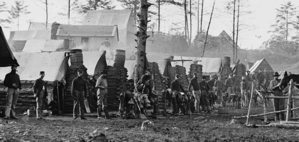 Image: Members of the 18th Pennsylvania Cavalry Regiment pose in their camp, with horse saddles and newly built
